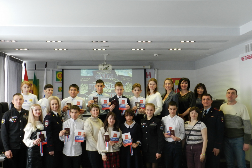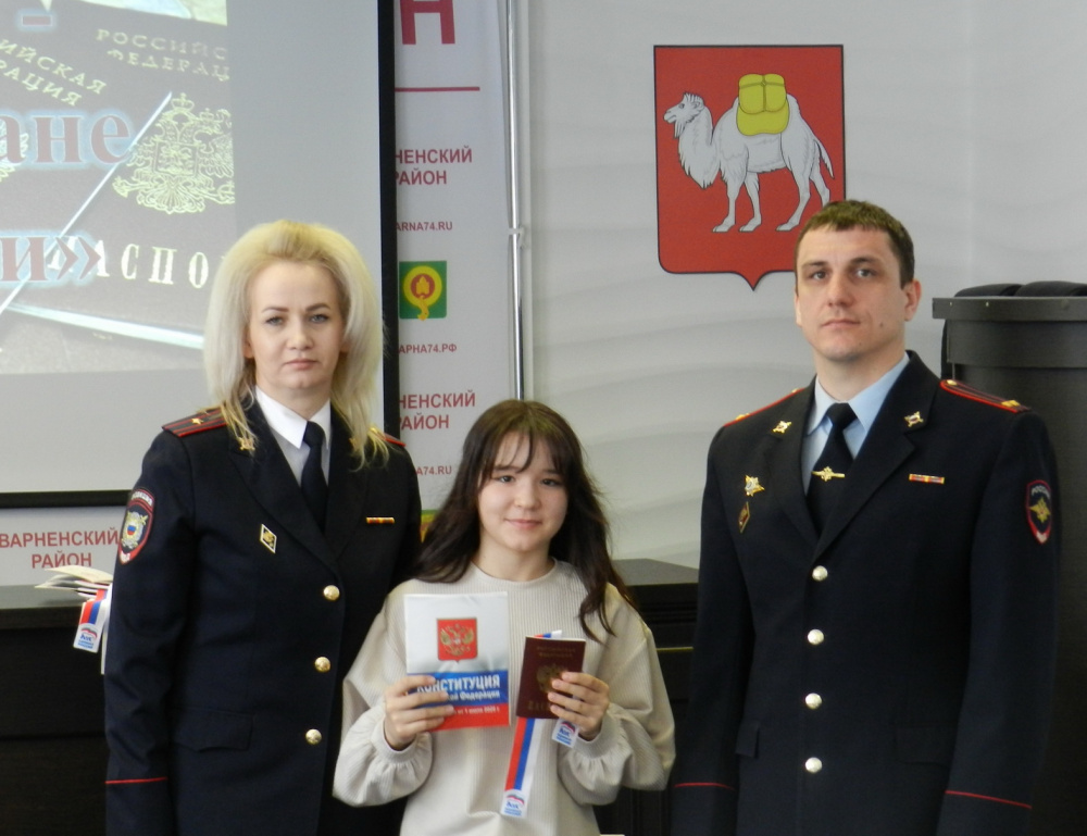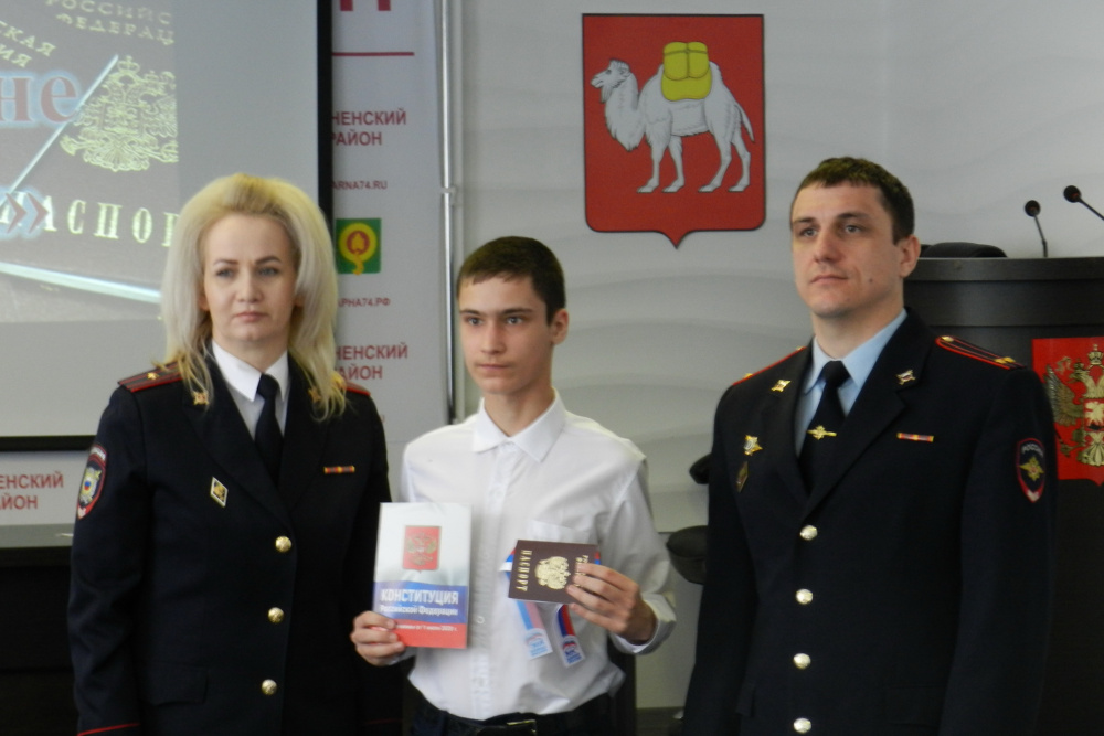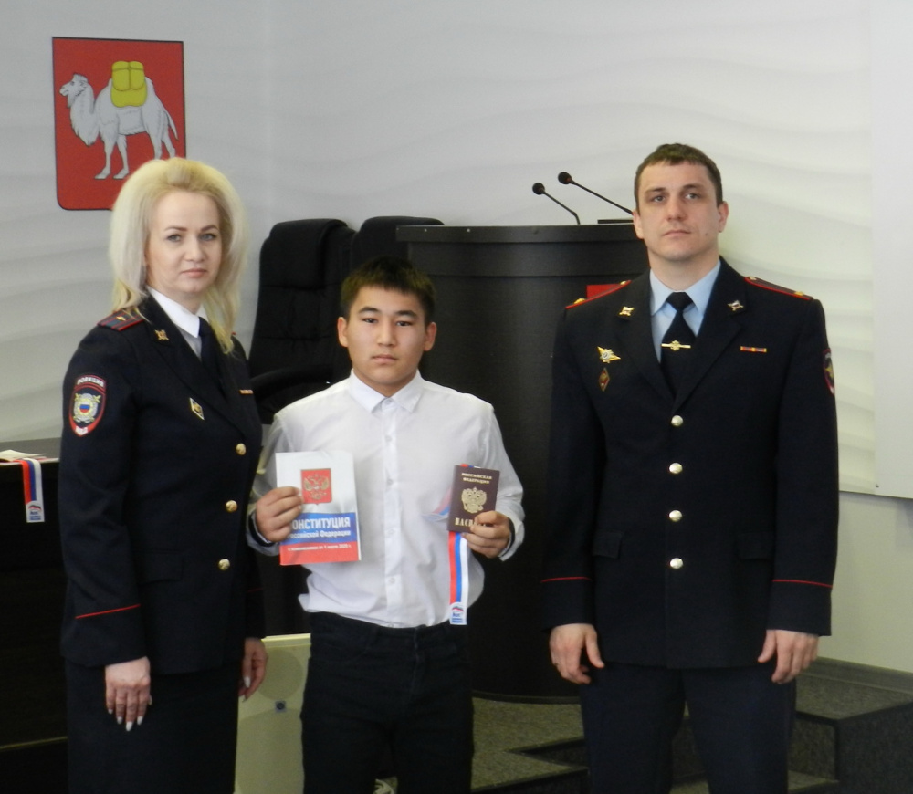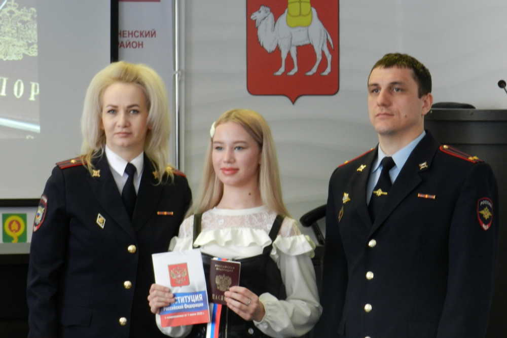 Главный документ юным гражданам вручили вместе с книгой с текстом Конституции Российской Федерации заместитель начальник отдела подполковник внутренней службы Николай Рыбаков и начальник отделения по вопросам миграции майор полиции Олеся Самокиш.