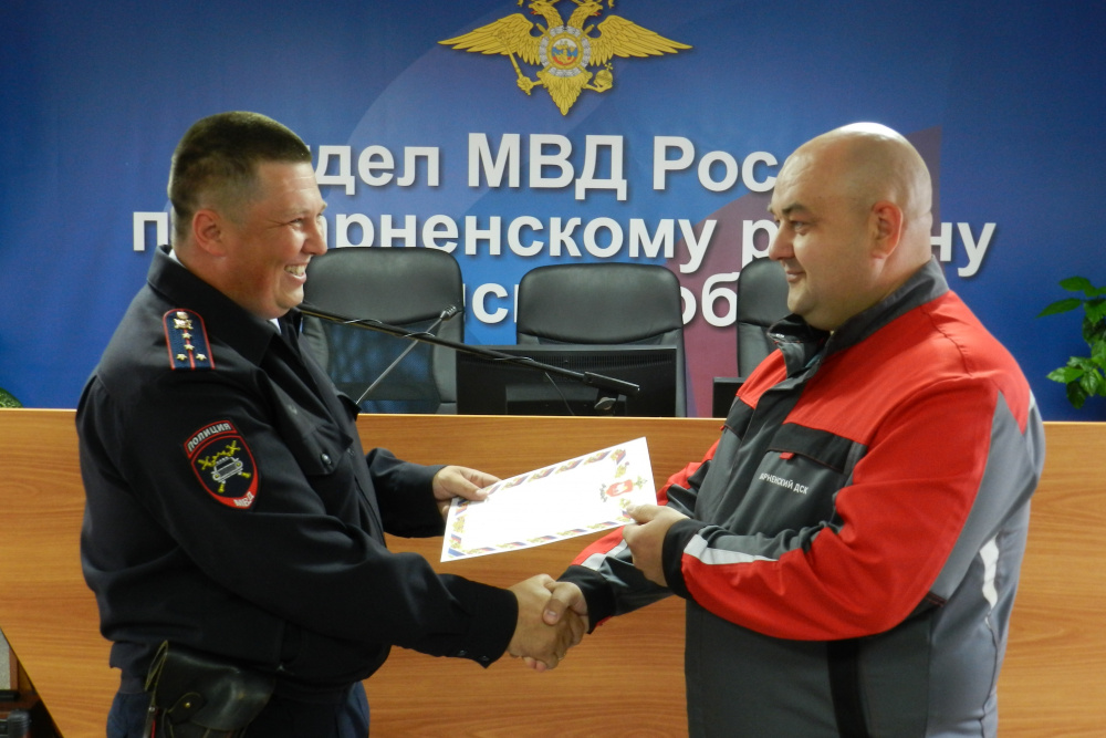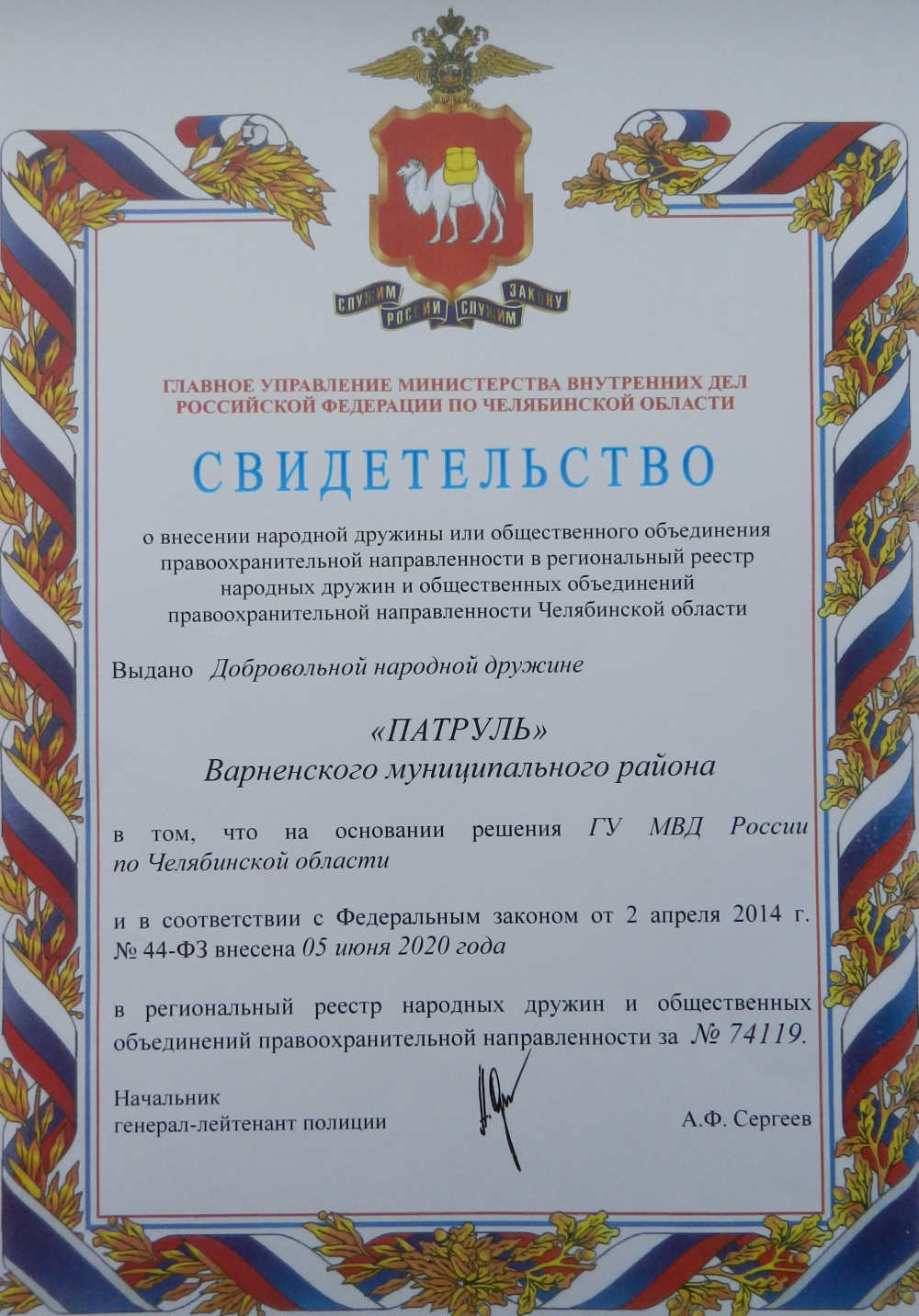 Начальник ОГИБДД ОМВД России по Варненскому району капитан полиции Денис Морозов вручил командиру Олегу Михайлову свидетельство о внесении добровольной народной дружины «Патруль» в региональный реестр правоохранительной направленности Челябинской области.