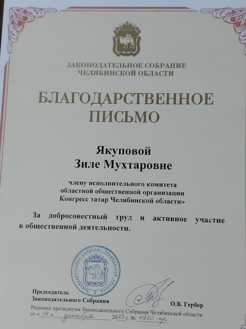 Зиля Мухтаровна Якупова получила Благодарственное письмо от Законодательного собрания за успешную и плодотворную работу с подрастающим поколением, что является заслуженным признанием её труда и вклада в развитие татарской национальной культуры.