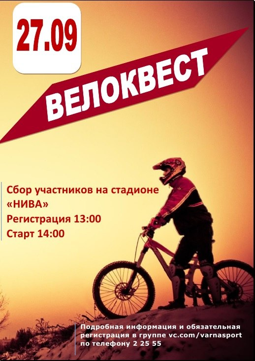 28 сентября Варненская молодежь приняла участие в спортивно-интеллектуальной игре с ориентированием на местности «Велоквест Варна-2014 Я выбираю спорт!». Мероприятие было организовано Отделом по делам молодежи физической культуры и спорта Администрации Варненского муниципального района в рамках акции «Я выбираю здоровье» и «Спорт против наркотиков!»