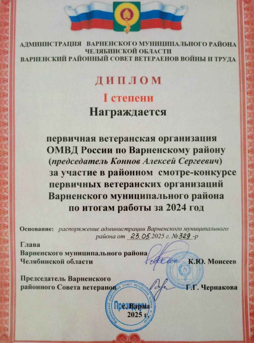 Определены победители - дипломом I степени награжден председатель ветеранской организации ОМВД России по Варненскому району майор юстиции в отставке Алексей Коннов за участие в районном смотре-конкурсе первичных ветеранских организаций Варненского муниципального района по итогам работы за 2024 год. Эта ступень почета удерживается ветеранами ОВД уже третий год.