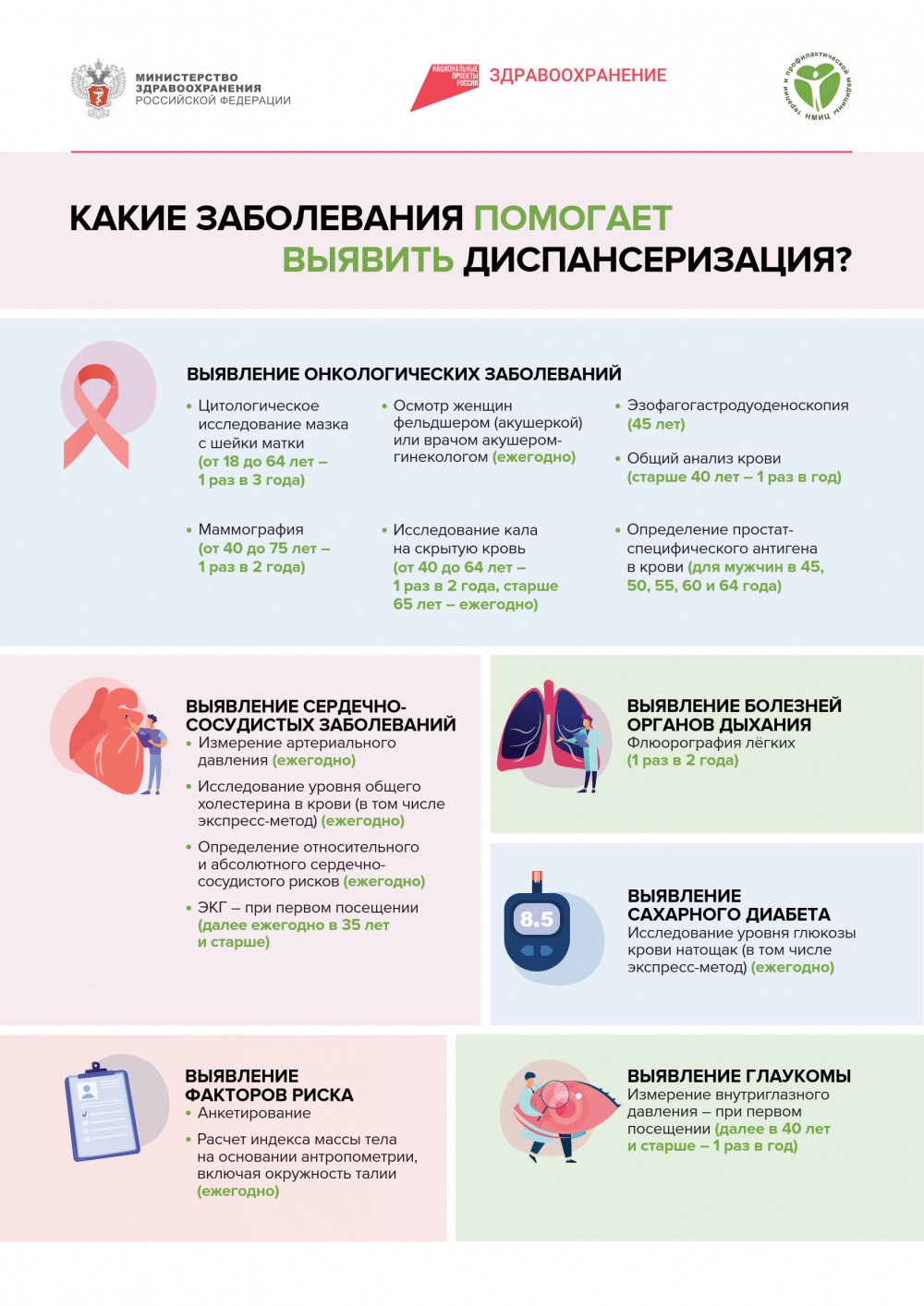 Необходимо помнить, что регулярное прохождение диспансеризации дает возможность вовремя остановить развитие какого-либо опасного заболевания. Ведь проще предупредить болезнь, и тогда необходимое лечение даст желанный положительный эффект.