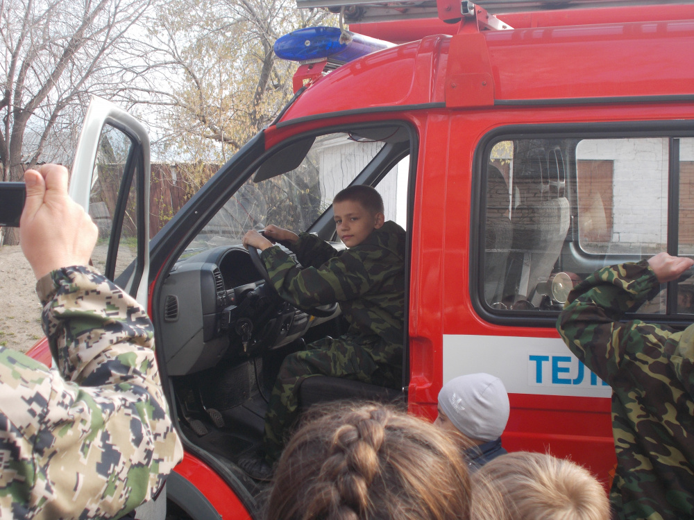И вот поступил сигнал об условном загорании травы на пришкольном участке. Юные пожарные Щербаков Максим, Дуньямалыев Роял, Забуга Антон быстро одевают боевую одежду, а водитель Файзуллин Данил уже находится за рулём пожарного автомобиля первой помощи. Прибыли к месту условного загорания, подали ствол и загорание ликвидировано в самое короткое время.