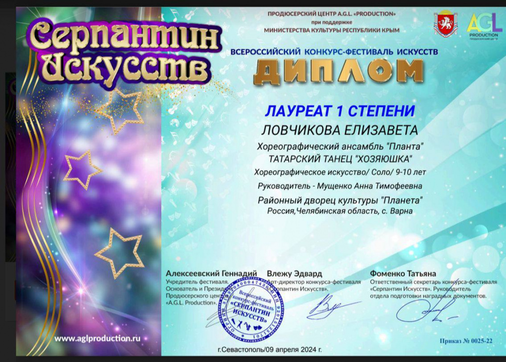 Солистка хореографического ансамбля «Планета» Елизавета Ловчикова представила на конкурс – фестиваль татарский танец «Хозяюшка». Елизавета награждена дипломом лауреата 1 степени.