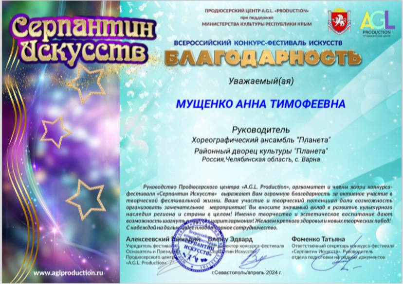 Благодарностью конкурса - фестиваля награждена Мущенко Анна Тимофеевна руководитель хореографического ансамбля «Планета».