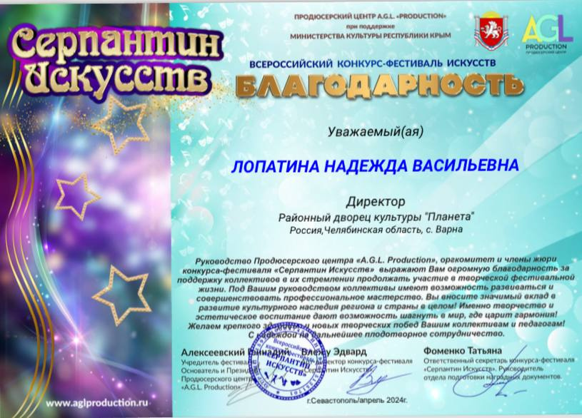За вклад в развитие культурного наследия района и страны в целом благодарностью отмечен Дворец культуры «Планета», в лице директора Лопатиной Надежды Васильевны.