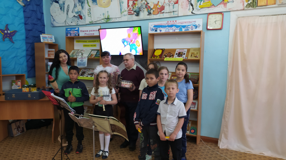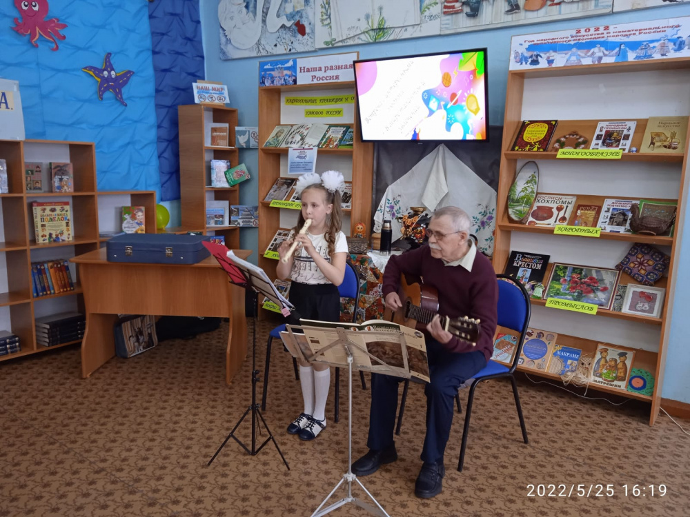 В ходе мероприятия, Вячеслав Александрович рассказал ребятам, как «пришел» в мир музыки, в каких странах побывал, также предложил детям попробовать поиграть на музыкальных инструментах, таких как ширкунок, реко реко, виброслеп, кастаньеты и др. На встречу Вячеслав Александрович пришел не один, а со своей ученицей Чубса Анной, которая уже год учится играть на флейте сапрано. В их совместном исполнении участники клуба с удовольствием прослушали такие произведения, как «Сурок», «Дятел» «Филет», Павано Арбо» и др.