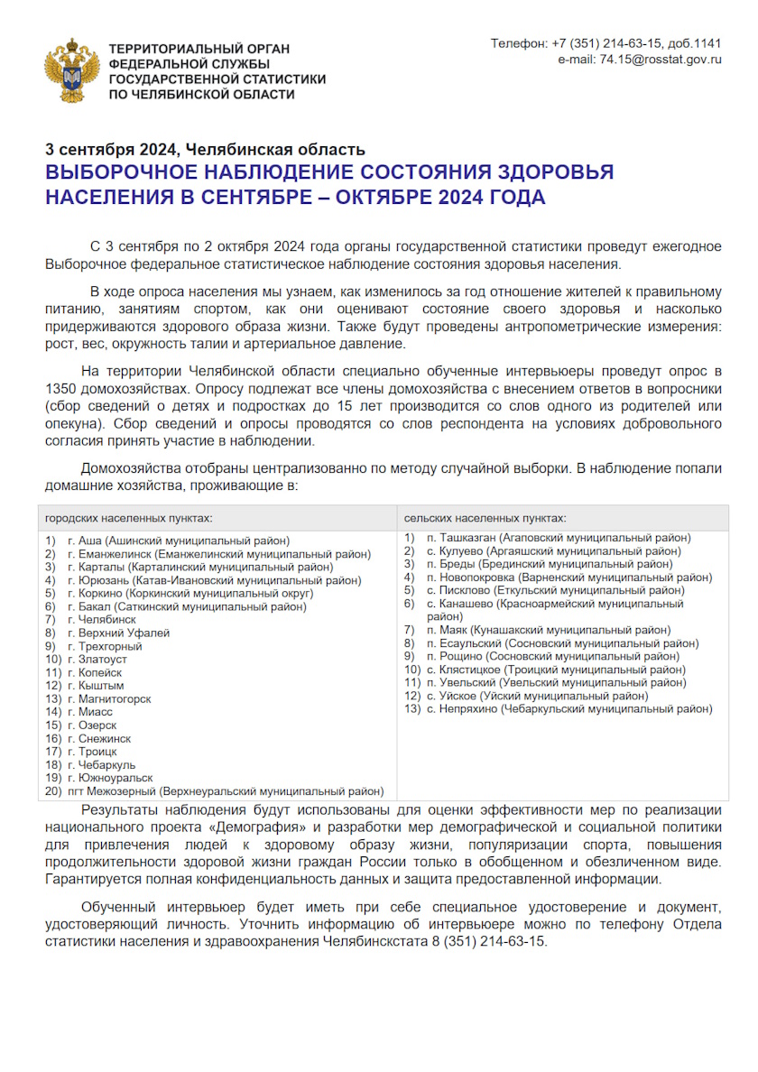 Выборочное наблюдение состояния здоровья населения в сентябре – октябре 2024 года