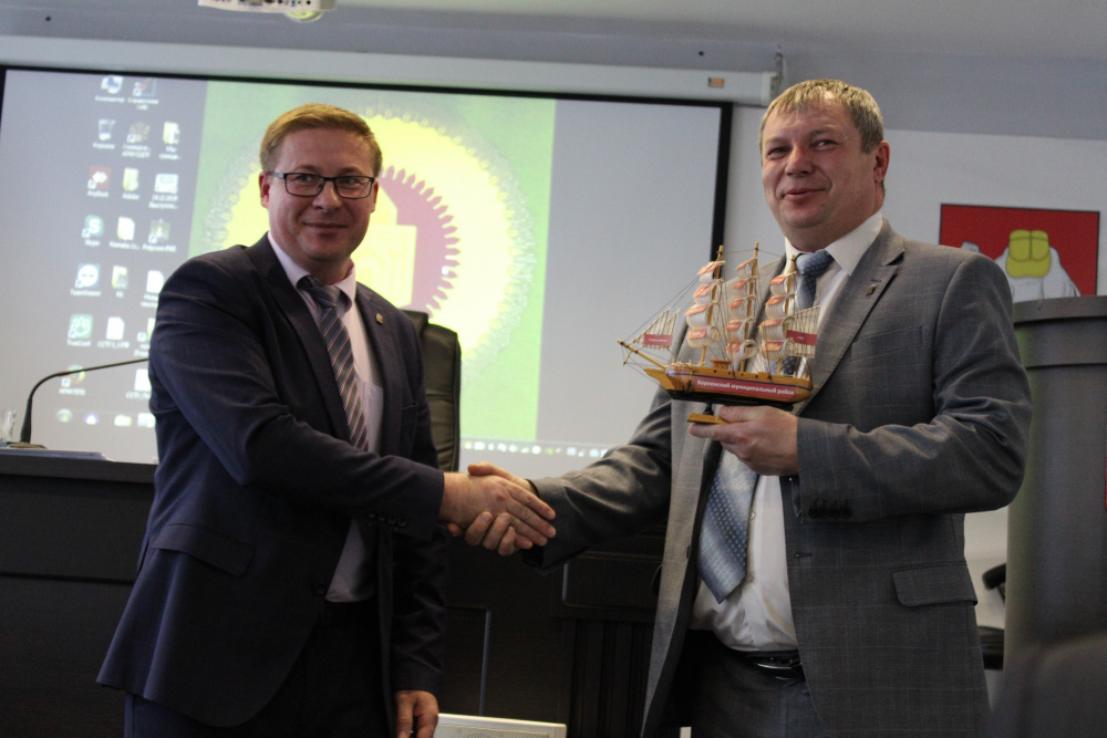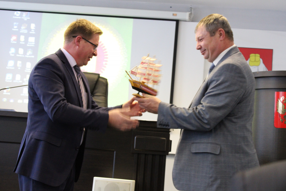Слова поздравления в адрес победителя прозвучали от председателя Собрания депутатов Варненского муниципального района Алексея Анатольевича Кормилицына. От депутатского корпуса он вручил Главе символический подарок – фрегат по имени «Варненский муниципальный район», где каждый парус несет название одного из структурных подразделений района.