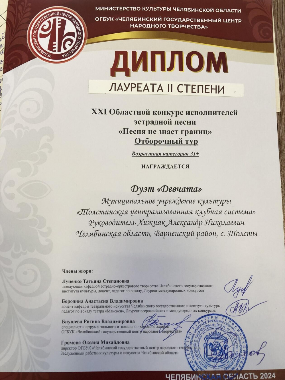 В конкурсе приняли участие солисты и ансамбли районов Челябинской области. Толстинский Дом культуры показал высокие результаты выступлений. Шапошников Илья стал Лауреатом I степени и дуэт «Девчата» - Лауреатами II степени