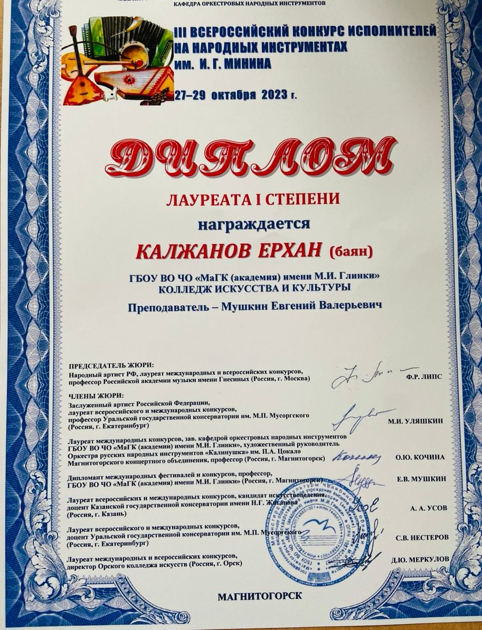 В этот день, к сожалению Ерхан не смог присутствовать на награждении, так как он принимал участие в III всероссийском конкурсе исполнителей на народных инструментах им. И.Г. Минина, где стал лауреатом I степени.