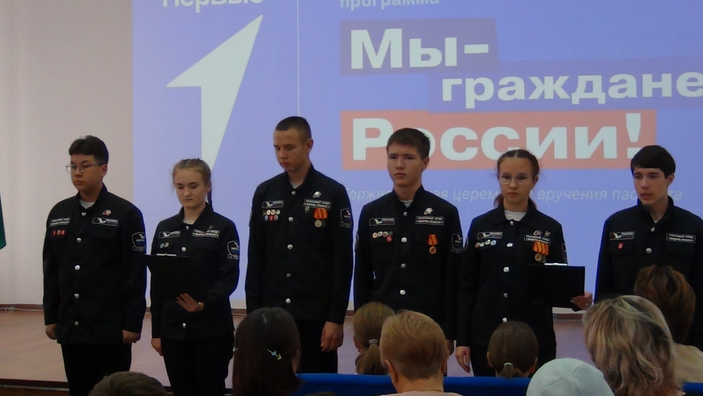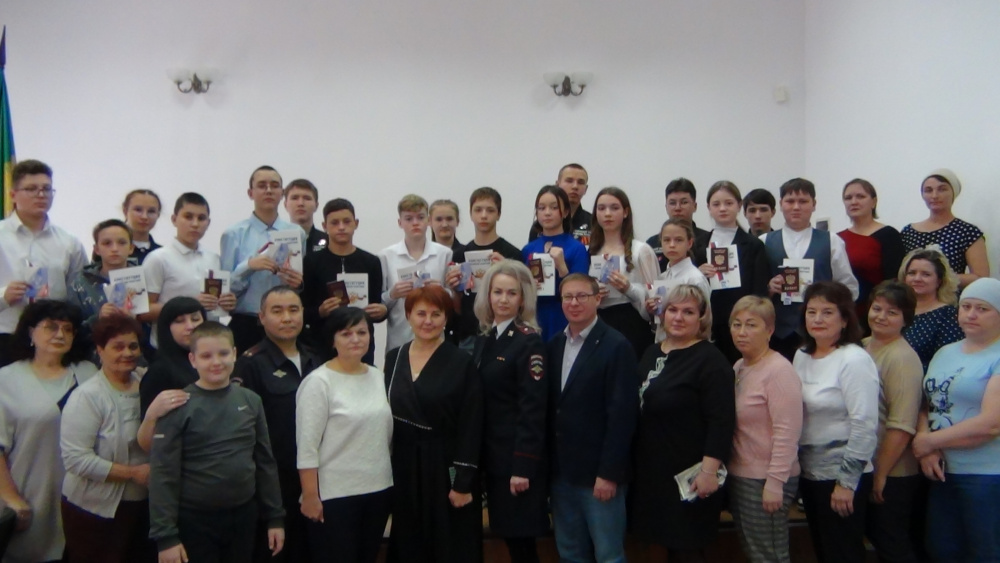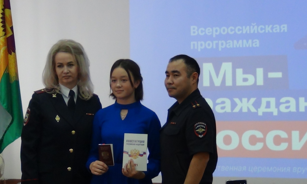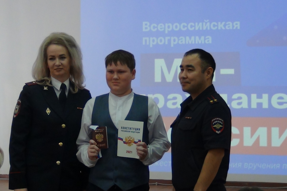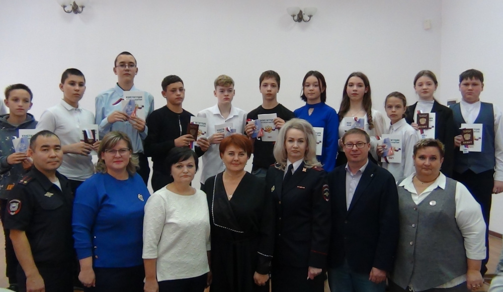Право вручить главный документ юным гражданам было предоставлено заместителю начальника полиции подполковнику полиции Жанату Тюлепаеву и начальнику отделения по вопросам миграции майору полиции Олеси Самокиш. Под аплодисменты свои первые паспорта получили 13 школьников. Вместе с паспортом школьникам вручили книги с текстом Конституции Российской Федерации