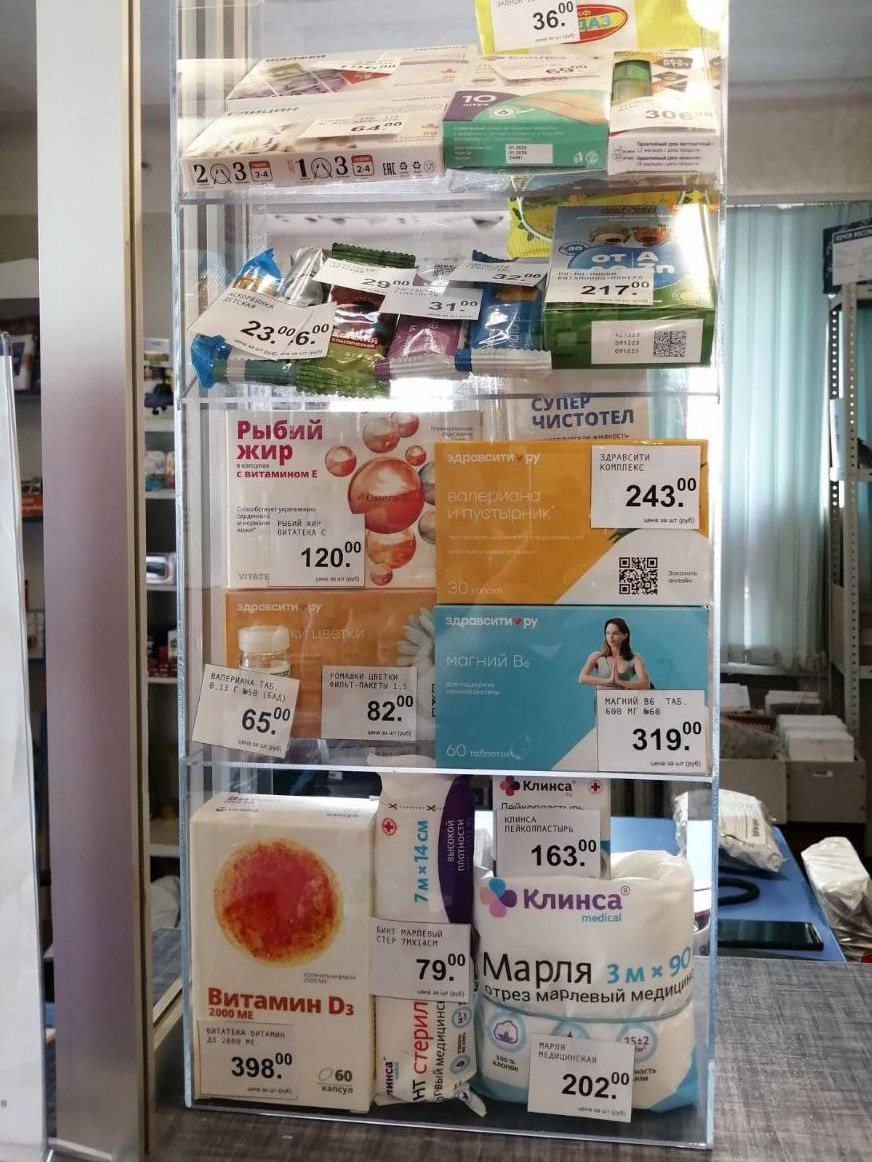 Ассортимент фармацевтической продукции выделен в отдельном диспенсере непосредственно рядом с окном оператора. Наполнение и расширение ассортимента будет производиться по запросам клиентов.