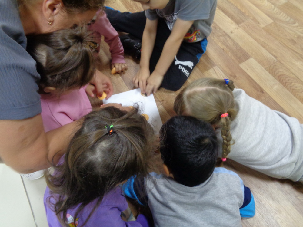 Ребятки маленькие, но с заданиями справились быстро. В конце игры на лист бумаги все наклеили смайлики, которые отражают их сегодняшнее настроение.