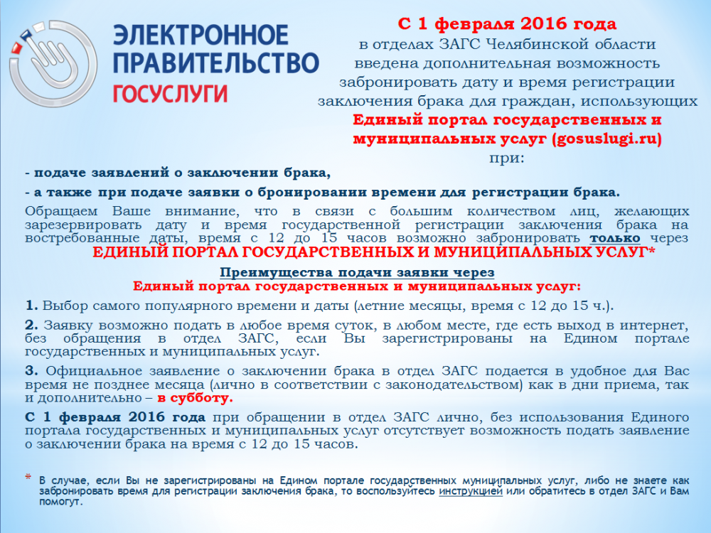 Строка навигации Главная > Подача заявления на заключение брака через единый портал государственных услугПодача заявления на регистрацию рождения ребенка через единый портал государственных услугУслуги на портале gosuslugi.ruВидео фильмы о возможностях на портале ГосуслугРазделы сайтаНовости отдела ЗАГС