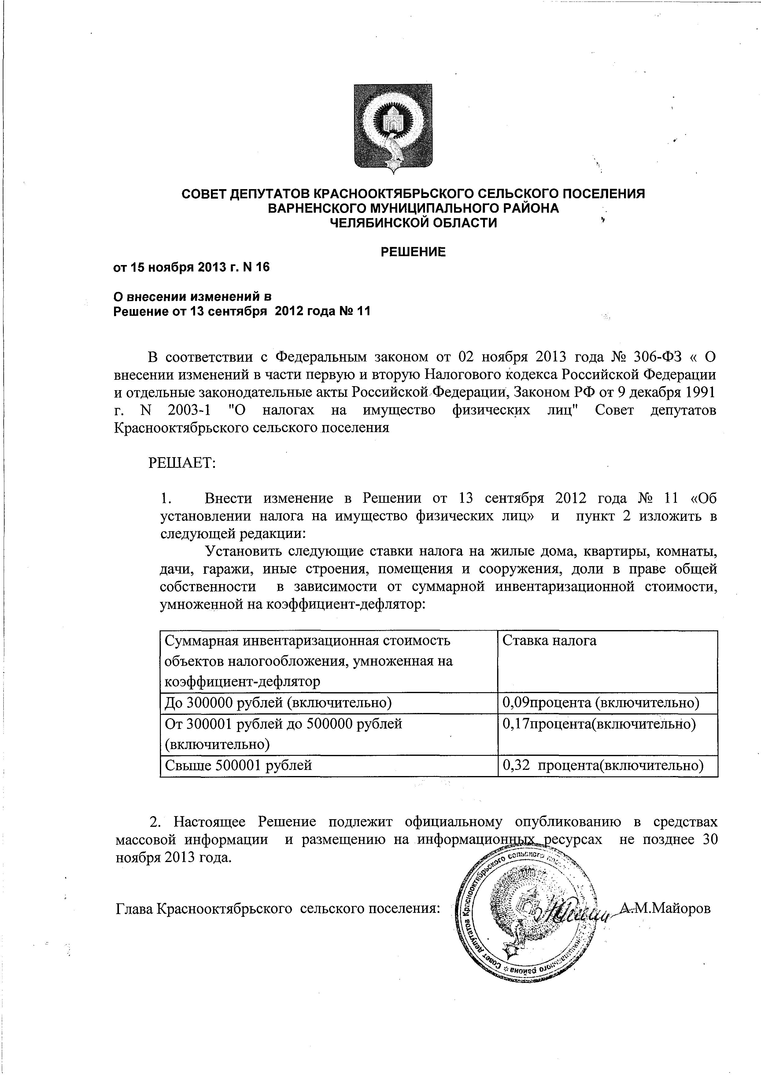 Решение № 15 О внесении изменений в Решение № 11 от 13.09.2012г "Об установлении налога на имущество физических лиц"439.1 КБ