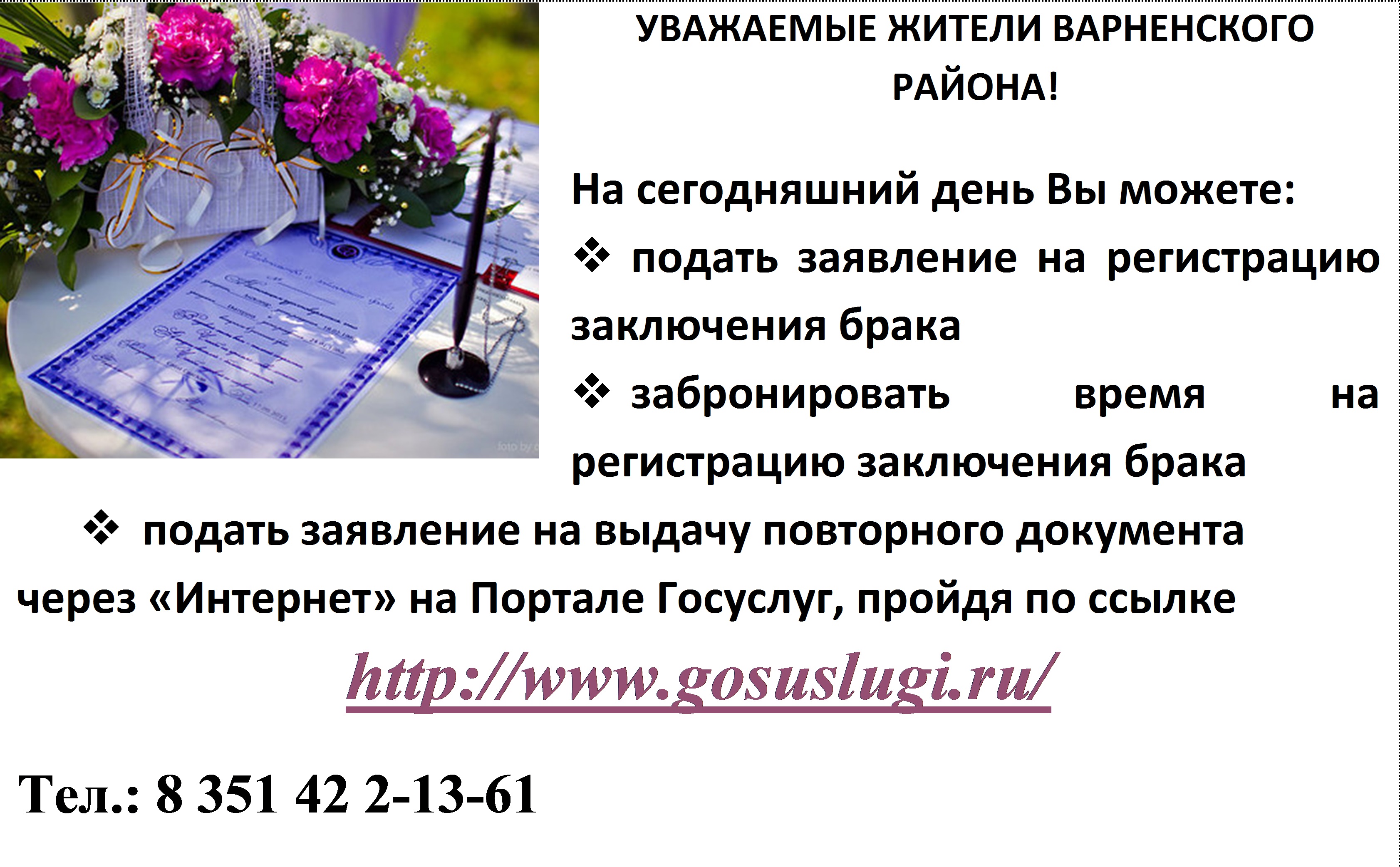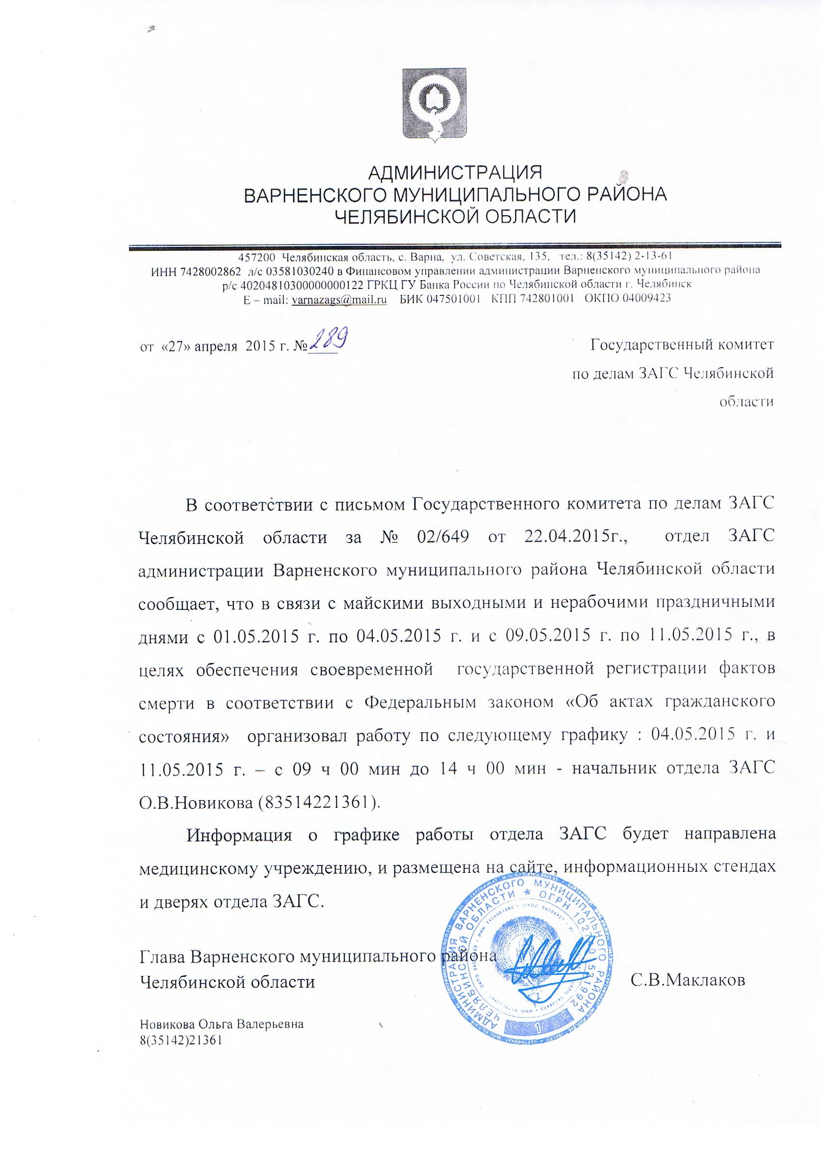 Уважаемые жители Варненского района! Отдел ЗАГС администрации Варненского муниципального района доводит до Вашего сведения, что с 01.04.2013 года Госкомитетом по делам ЗАГС Челябинской области в целях обеспечения доступности государственной услуги по государственной регистрации актов гражданского состояния на территории Челябинской области рекомендован единый график работы и приёма граждан по области отделами ЗАГС. Просим обратить Ваше внимание на вступившие в силу изменения в режим и график работы отдела ЗАГС Варненского района, во избежание недоразумений предлагаем перед посещением отдела ЗАГС дополнительно уточнить часы приёма граждан.