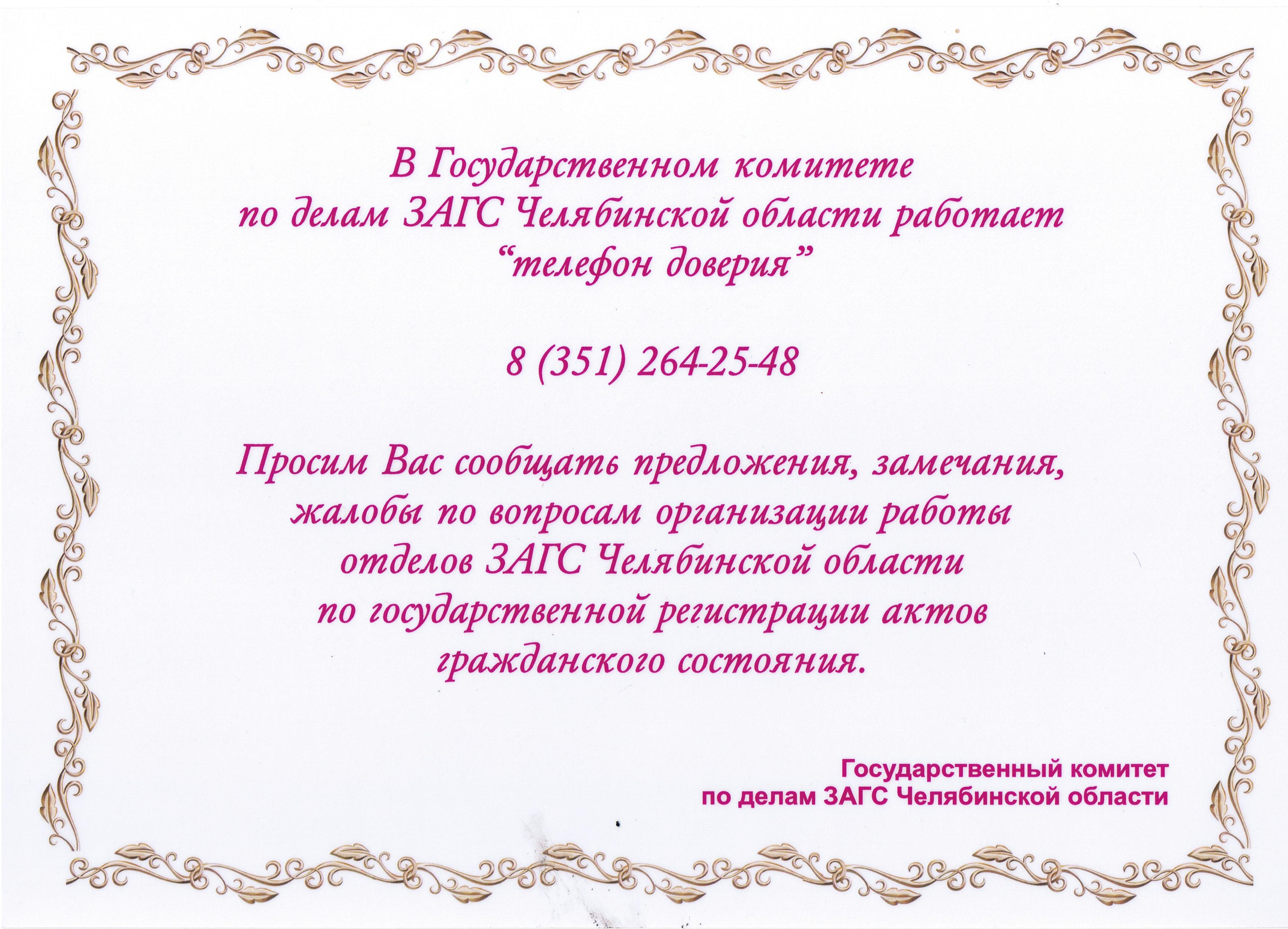 Все консультации в сфере ЗАГС можно получить, не выходя из дома, по телефонам органов ЗАГСили по телефону горячей линии Государственного комитета по делам ЗАГС 8(351)266-64-96, 8(351)264-25-48.