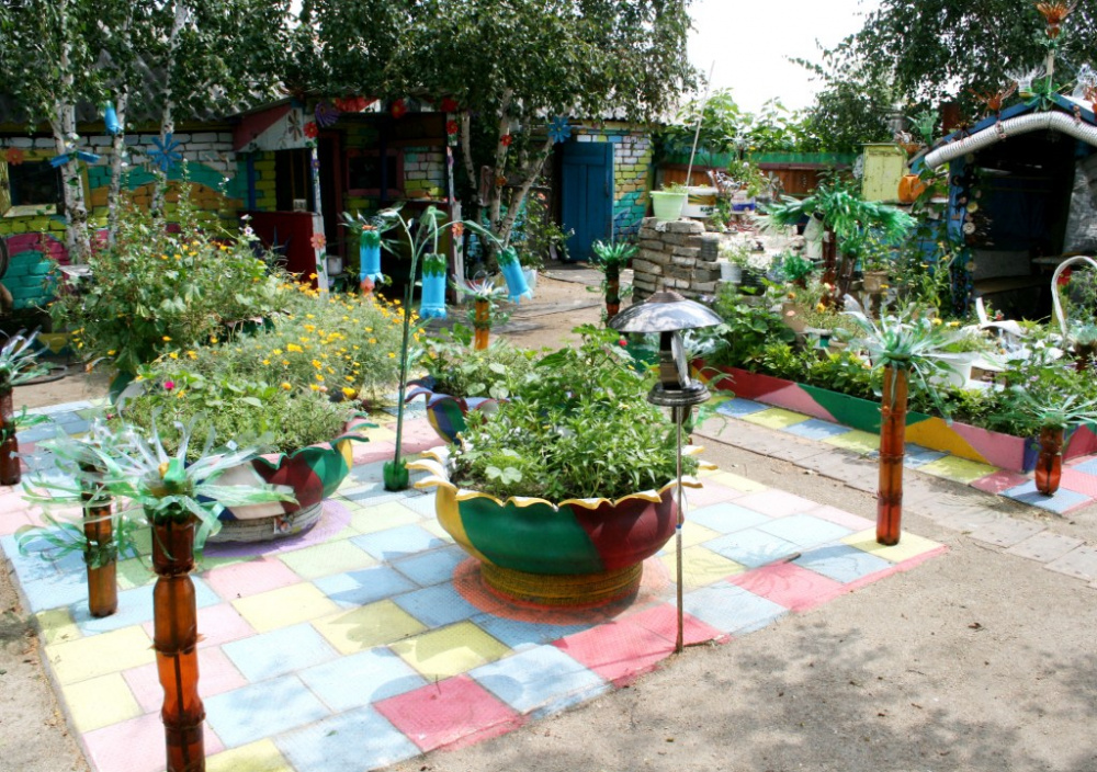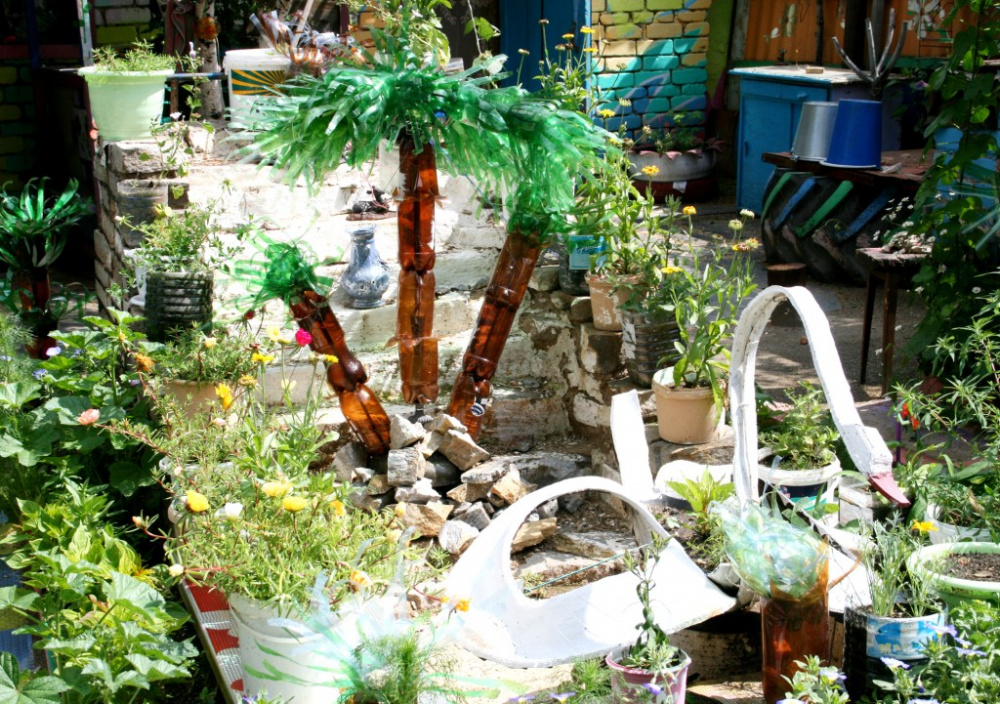 Разглядывая его творение во дворе и возле двора дома, понимаешь: ведь всё это создано из незатейливого материала, который есть в каждом доме и просто выкидывается на свалку. И не подумаешь, что из обычных пластмассовых бутылок, автомобильных колёс и прочей мелочи можно так искусно сотворить различные художественные образы. Вот и часы нашли себе место. Их Владимир Михайлович нашёл на свалке. Поставил батарейку и они начали «ходить», с речки камни привёз, формой напоминавшие различных животных. По словам хозяйки он постоянно что-то приносил домой, фантазировал, чтобы эту вещь как-то вписать в образ своего двора словно художник не дорисовавший свою картину, добавляя туда новые краски.