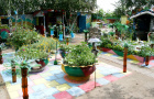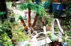 В палисаднике и во дворе чего только нет: камни в образе черепахи и дракона, белые лебеди, грациозный фонтан, пальмы, колокольчики, грибочки, беседка, и многое другое. Всё это сопровождается богатым озеленением: расписные клумбы, горшочки с огромным разнообразием пестреющих цветов. Сверху возле дома в виде шатра на верёвках вьются вьюнки. Такое ощущение, что мы попали в маленький сказочный мир.