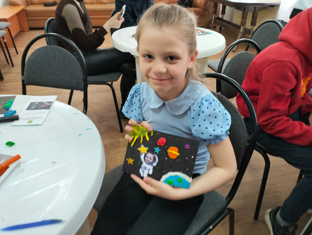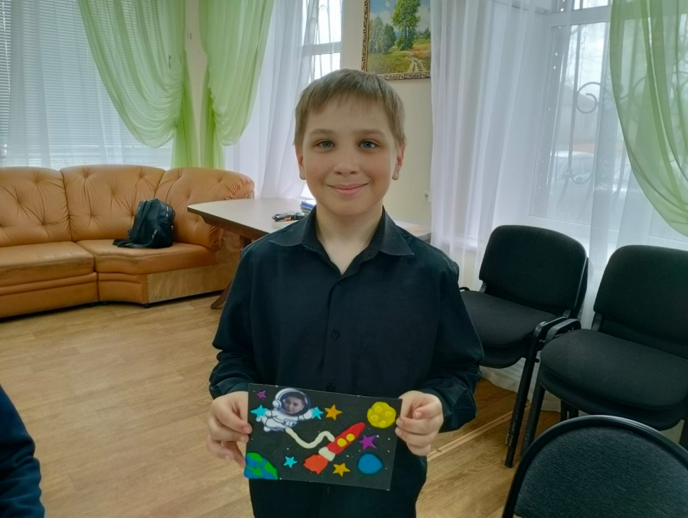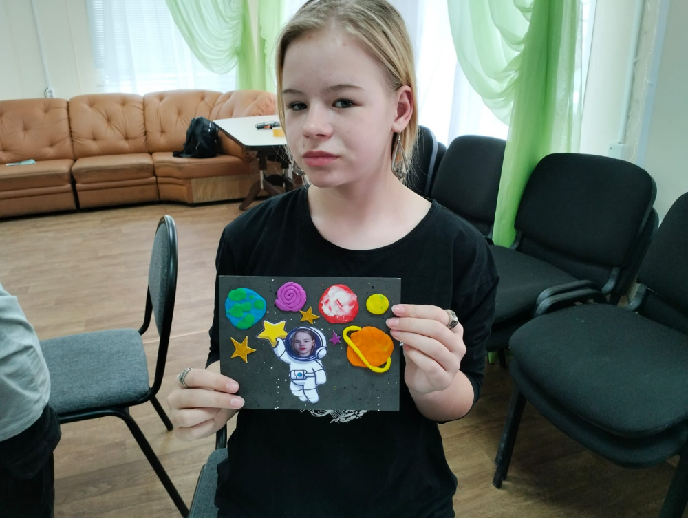 Специалисты отделения помощи семье и детям ознакомили детей с историей освоения человеком космоса, дети узнали, какие животные первые побывали в космическом пространстве. Ребята с удовольствием изготовили тематические аппликации с применением пластилина, фоамирана, бумаги. Сюрпризом для детей стали бумажные фигуры космонавтов с их фотографиями, которые дополнили аппликацию.
