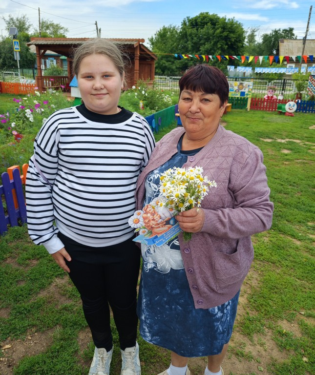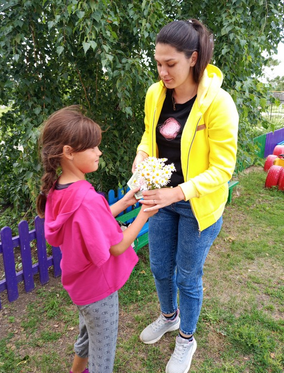 Девочки своими руками изготовили открытки и букетики из ромашек, которые дарили прохожим. Среди тех, кто получил поздравления, были продавцы, сотрудники почты и детского сада, а также жители посёлка.