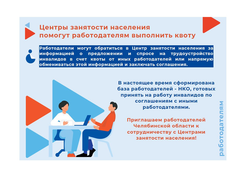 «Региональные Центры занятости населения берут на себя функцию по обмену информацией между работодателями, — рассказывает Александр Шегуров, начальник Главного управления по труду и занятости населения Челябинской области. — В Центрах занятости населения сформирована база данных работодателей — НКО, готовых принять на работу инвалидов по соглашениям с иными работодателями. Приглашаем работодателей Челябинской области к сотрудничеству!»