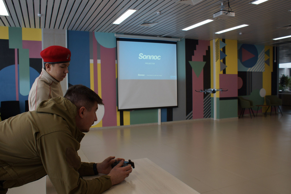 Краткий курс теории, ответы на вопросы, а далее практика: кто-то управляет дронами на симуляторе, кто-то на реальной модели. Кстати, реальную модель ребята принесли на занятие сами, это подарок юнармейцам от кадровых военнослужащих. Говорят, первое время очень бережно и осторожно обращались с техникой, боясь повредить.