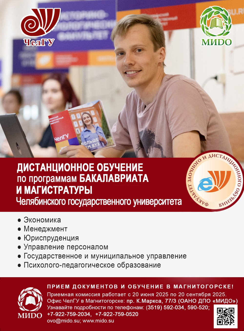 Магнитогорский институт дополнительного образования (ОАНО ДПО «МИДО») приглашает на обучение по программам высшего образования (бакалавриат, специалитет, магистратура) ФГБОУ ВО «Челябинский государственный университет» (ЧелГУ).