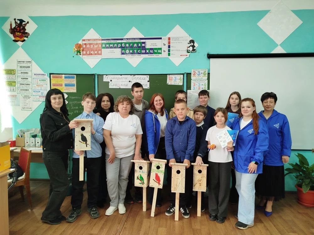 20 апреля 2026 года на базе МОУ СОШ п. Новый Урал для детей, состоящих на социальном сопровождении и постсопровождении в МУ «КЦСОН Варненского муниципального округа» и учащихся школы, сотрудники отделения помощи семье и детям совместно с волонтерами АО «Михеевский ГОК» провели мастер-класс по росписи скворечников.