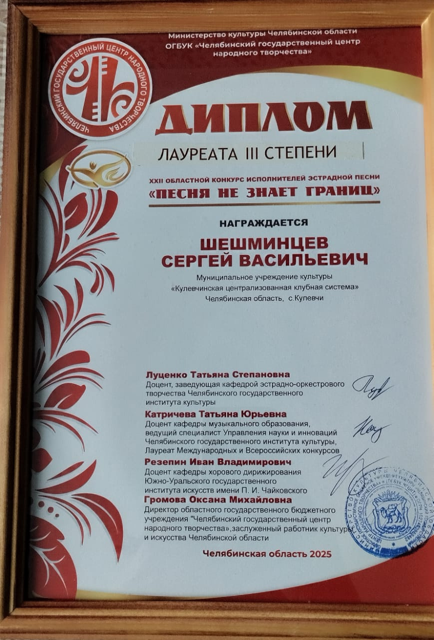 22 февраля 2025г. в районном Чесменском Доме культуры прошёл XXII областной конкурс исполнителей эстрадной песни «Песня не знает границ». От Варненского района выступал директор Кулевчинского Дома культуры Шешминцев Сергей Васильевич. Он исполнил песни «Лунная серенада» и «Гуси».