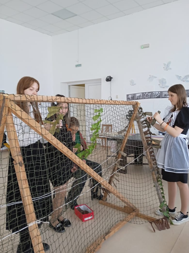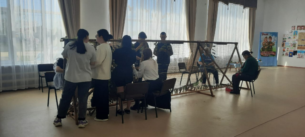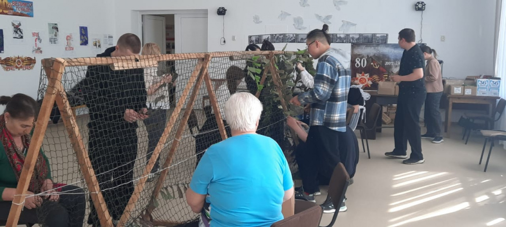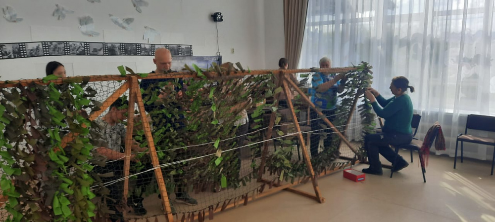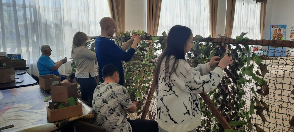 Вместе они работали над созданием маскировочных сетей для участников специальной военной операции, нарезали спанбонд на ленты, которые затем будут вплетаться в маскировочные сети.