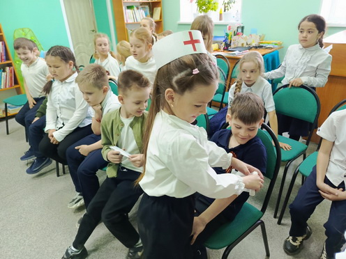 Для развития внимания, военной смекалки, воображения, ловкости участники мероприятия перевоплотились в артиллеристов, связистов, разведчиков, санитаров и др. военных «специалистов».