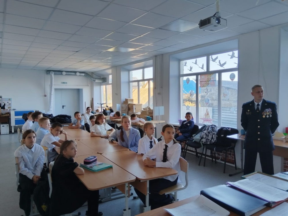 С целью патриотического воспитания подрастающего поколения председатель Совета ветеранов ОМВД России по Варненскому району майор юстиции в отставке Алексей Коннов со школьниками 5 класса МОУ СОШ №2 с. Варна и студентами филиала Карталинского межотраслевого техникума провел уроки мужества.