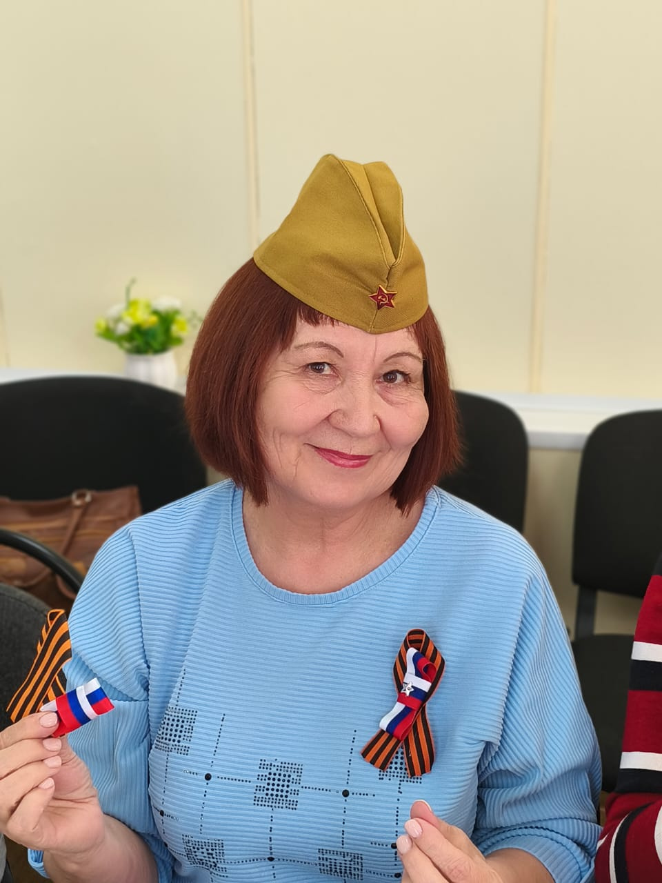 В этот день в гости клуба пришли волонтеры Михеевского ГОКа, которые провели с пенсионерами мастер-класс по изготовлению броши из георгиевской ленты.