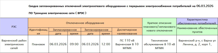 Сводка запланированных отключений электросетевого оборудования с перерывом электроснабжения потребителей на 06.03.2026