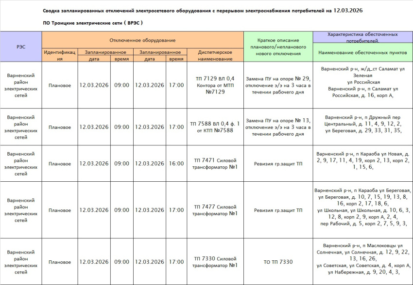 Сводка запланированных отключений электросетевого оборудования с перерывом электроснабжения потребителей на 12.03.2026