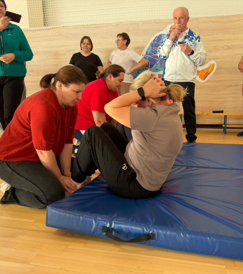 15 участниц разных возрастных групп совместно с начальником УСЗН – Прохоровой Еленой Сергеевной, выполнили комплекс упражнений, включавший бег на короткие дистанции, прыжки в длину, сгибание/разгибание рук в упоре лежа, наклоны вперед, стоя на гимнастической скамье, поднимание туловища, из положения лежа на спине.